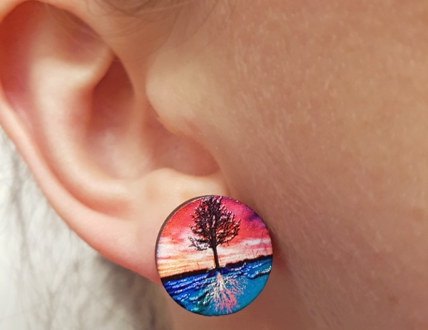 Wunderschöne 3D Ohrstecker aus Naturholzscheiben. Der 3D erhabene und "fühlbare" Effekt, entsteht durch die besondere Motivbemalung der Holzscheiben.