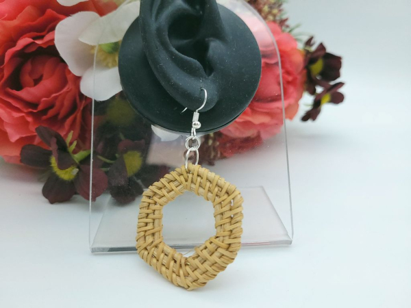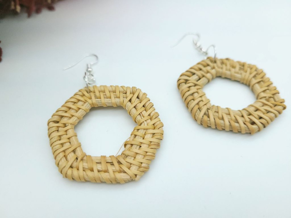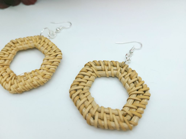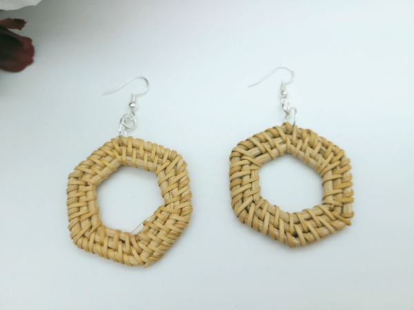 Wunderschöne Ohrringe mit Bambus Strohgeflecht als Anhänger in Form von Sechseck in beige.