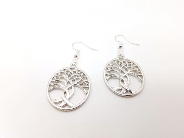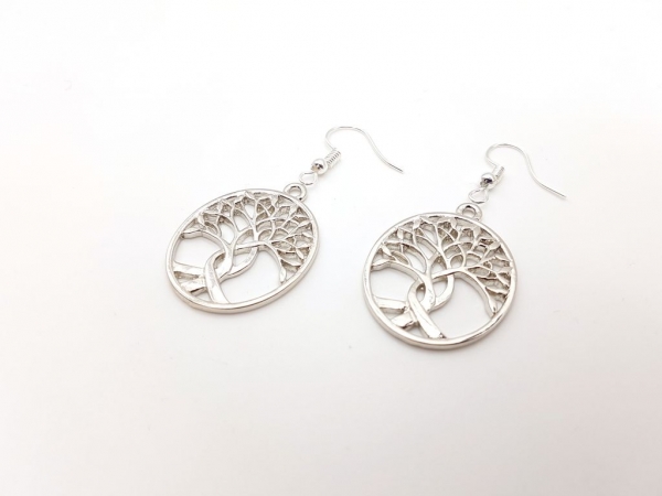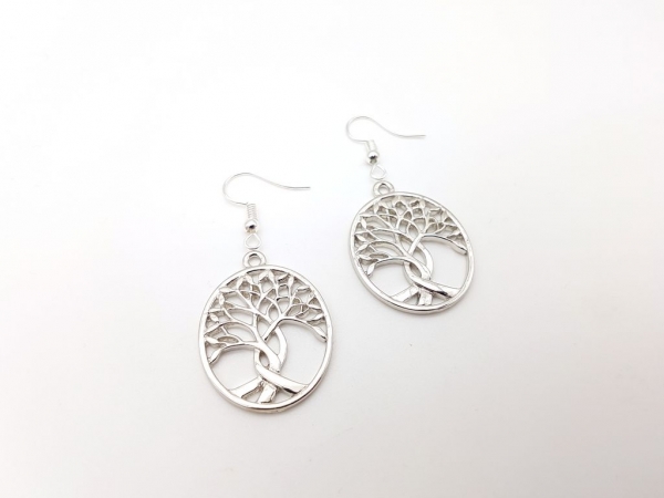 Wunderschöne Ohrringe mit silberfarbenen Bäumen als Anhänger.
