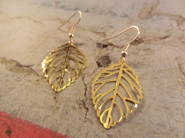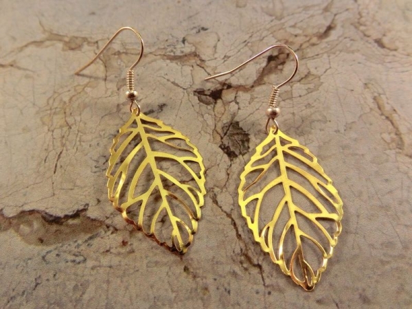 Sehr schöne Ohrringe mit einem goldfarbenen Blatt als Anhänger.