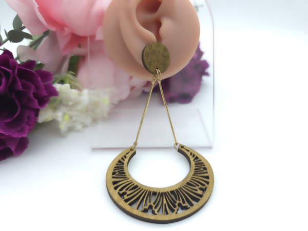Wunderschöne große Holz Ohrringe im Boho Stil mit Stecker - die Hänger sind in Halbrunder Mond-Form mit schönen Aussparungen und goldfarbenen, dünnen Metallstäben.