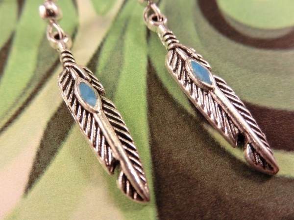 Schöne Ohrringe mit Federn als Anhänger, mit blau abgesetzt, im Stil von Indianer Federn.