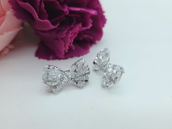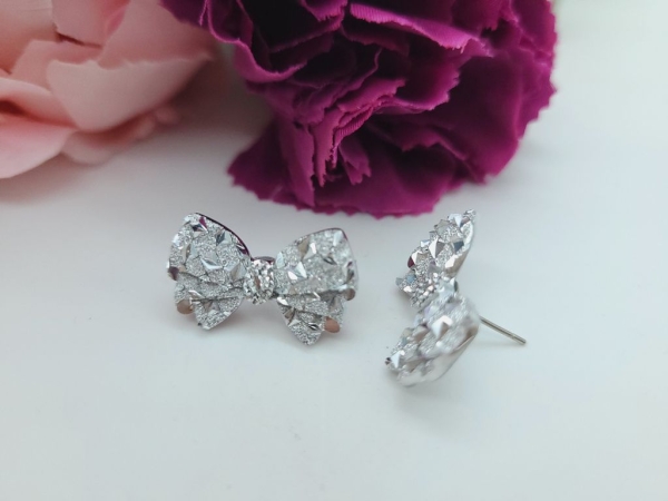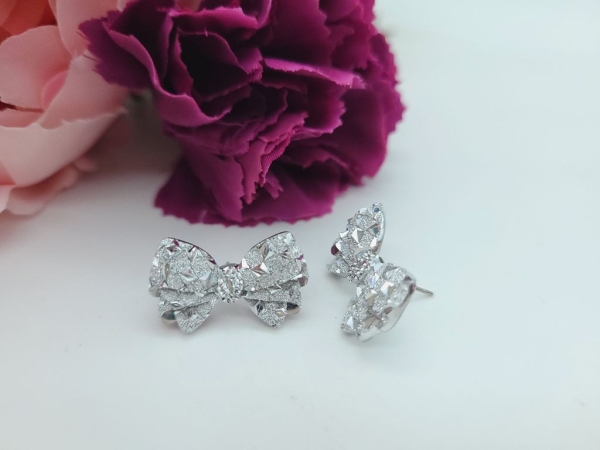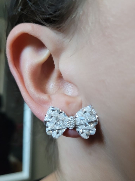 Ausgefallene, große Ohrstecker in Form von silberfarbenen Glitzer Schleifen.