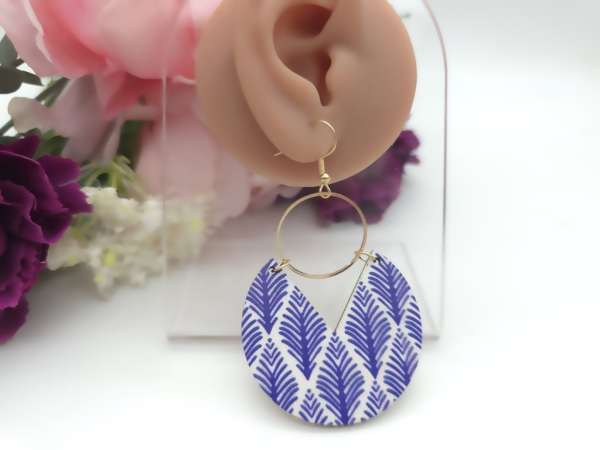 Wunderschöne große Holz Ohrringe mit runden Anhängern und dünnen Metallstreben in rosegoldfarben.