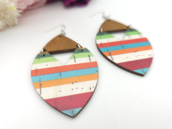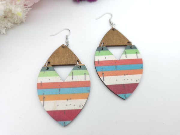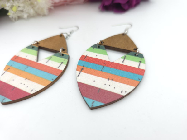 Wunderschöne große Holz Ohrringe mit braunen sowie bunt gestreiften Holzteilen als Anhänger.