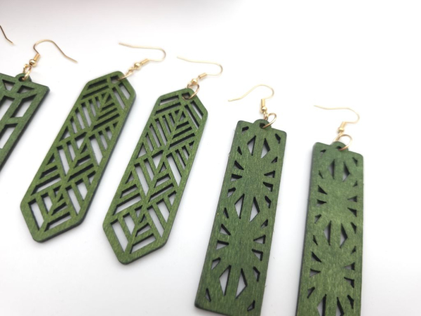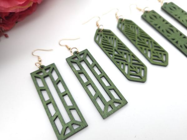 Schöne rechteckige Ohrringe mit dunkelgrünen Holzteilen als Anhänger mit Mustern.