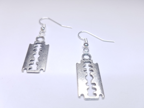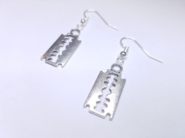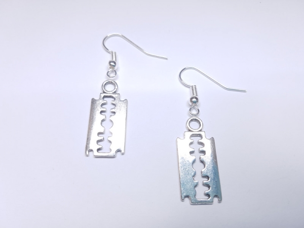 Witzige Ohrringe mit silberfarbenen Rasierklingen als Anhänger.