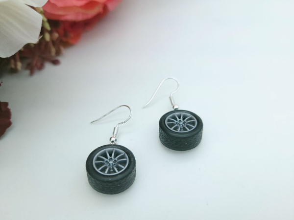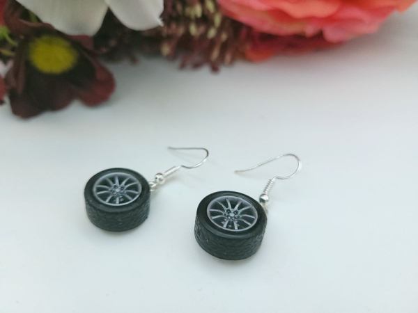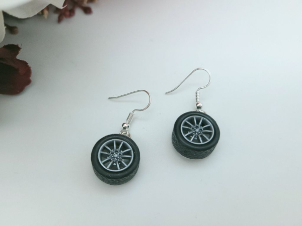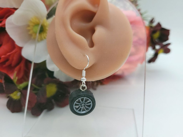 Ausgefallene Reifen Motiv Anhänger Ohrringe, in schwarz und grau.