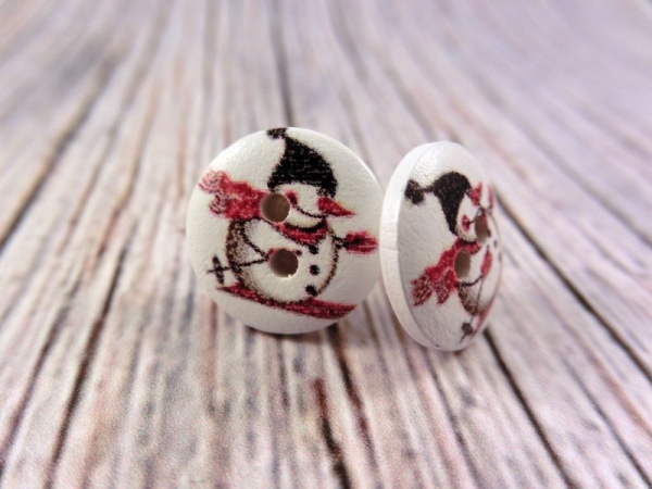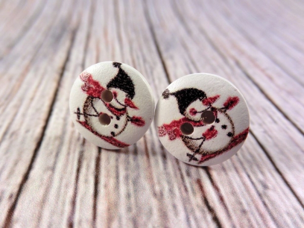 Süsse Ohrstecker aus weißen Holzknöpfen mit buntem Aufdruck eines Skifahrenden Schneemanns.