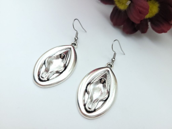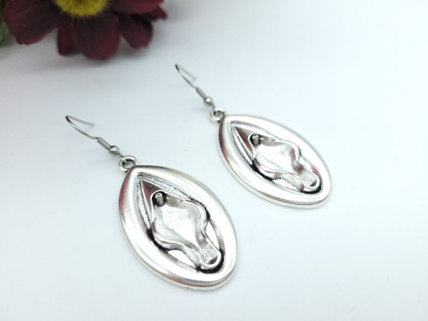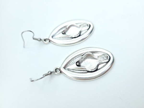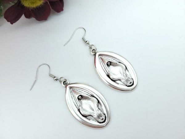 Ausgefallene silberfarbene Ohrhänger in Form von einer Vagina/Vulva.